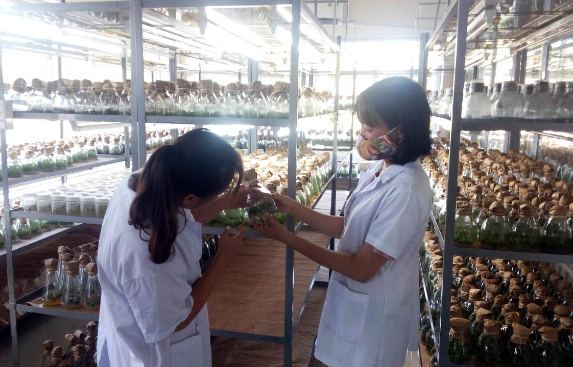 | Chị Nguyễn Thị My (bên phải) và đồng nghiệp kiểm tra kết quả thí nghiệm. |