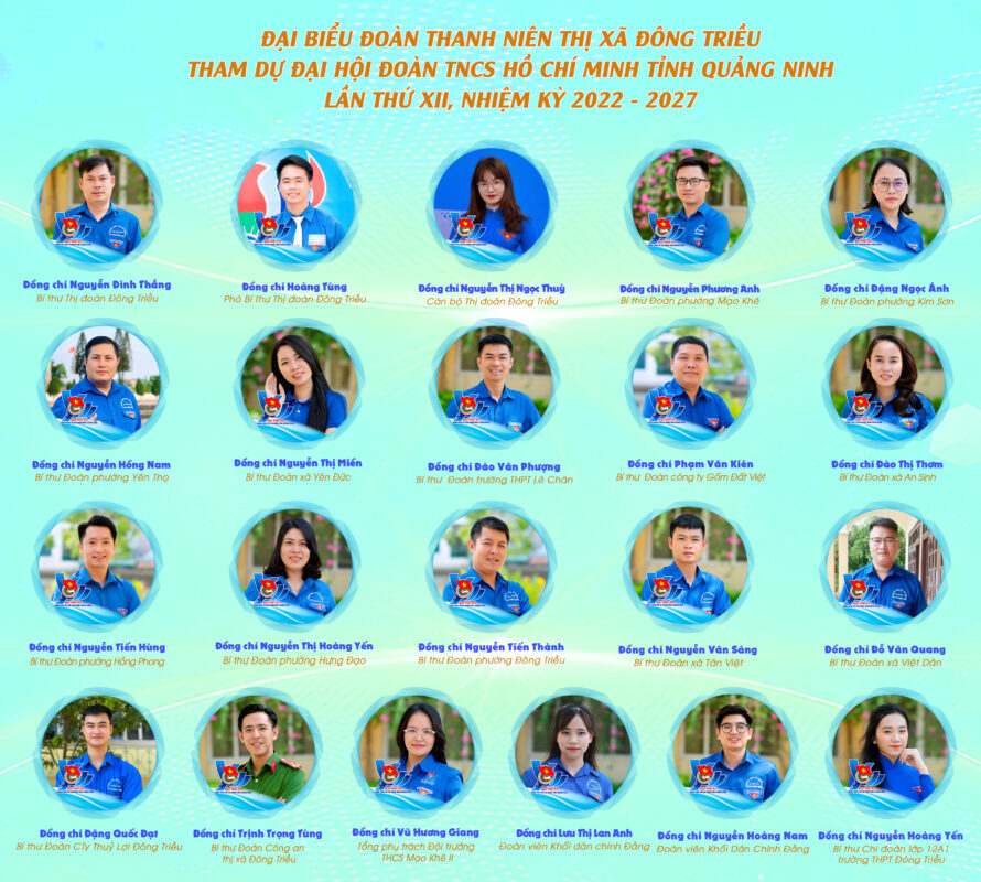 Sau đây, xin trân trọng giới thiệu Đoàn đại biểu Thanh niên Thị xã Đông Triều tham dự Đại hội đại biểu Đoàn TNCS Hồ Chí Minh tỉnh Quảng Ninh lần thứ XII, nhiệm kỳ 2022 – 2027 gồm 21 đồng ch.