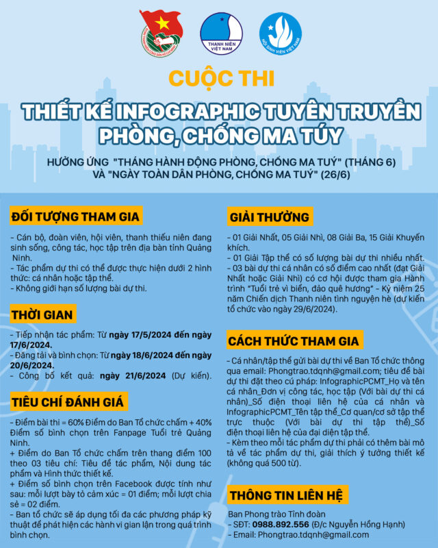 Thiết thực tổ chức các hoạt động hưởng ứng “Tháng hành động phòng, chống ma tuý” (tháng 6) và “Ngày toàn dân phòng, chống ma tuý” (26/6); Ban Thường vụ Tỉnh đoàn – Ban Thư ký HSV tỉnh tổ chức cuộc thi “Thiết kế Infographic tuyên truyền phòng, chống ma túy”Hưởng ứng Tháng Hành động phòng, chống ma tuý năm 2024.