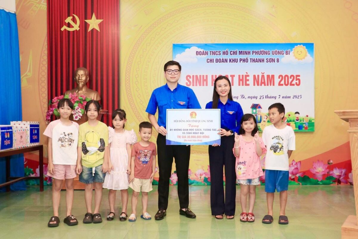 Nhân dịp này, đồng chí Bí thư Tỉnh đoàn, Chủ tịch Hội đồng Đội tỉnh đã trao tặng công trình “Không gian đọc sách, tương tác và sinh hoạt Đội” trị giá 30 triệu đồng cho Trường Tiểu học & THCS Điền Công, phường Uông Bí. Đây là công trình thứ 4 trong tuyến công trình dành cho thiếu nhi của Tỉnh đoàn – Hội đồng Đội tỉnh chào mừng Đại hội Đảng bộ tỉnh Quảng Ninh lần thứ XVI, nhiệm kỳ 2025 – 2030. Đồng thời, đồng chí cũng trao tặng những phần quà ý nghĩa cho các em thiếu nhi tham dự buổi sinh hoạt.