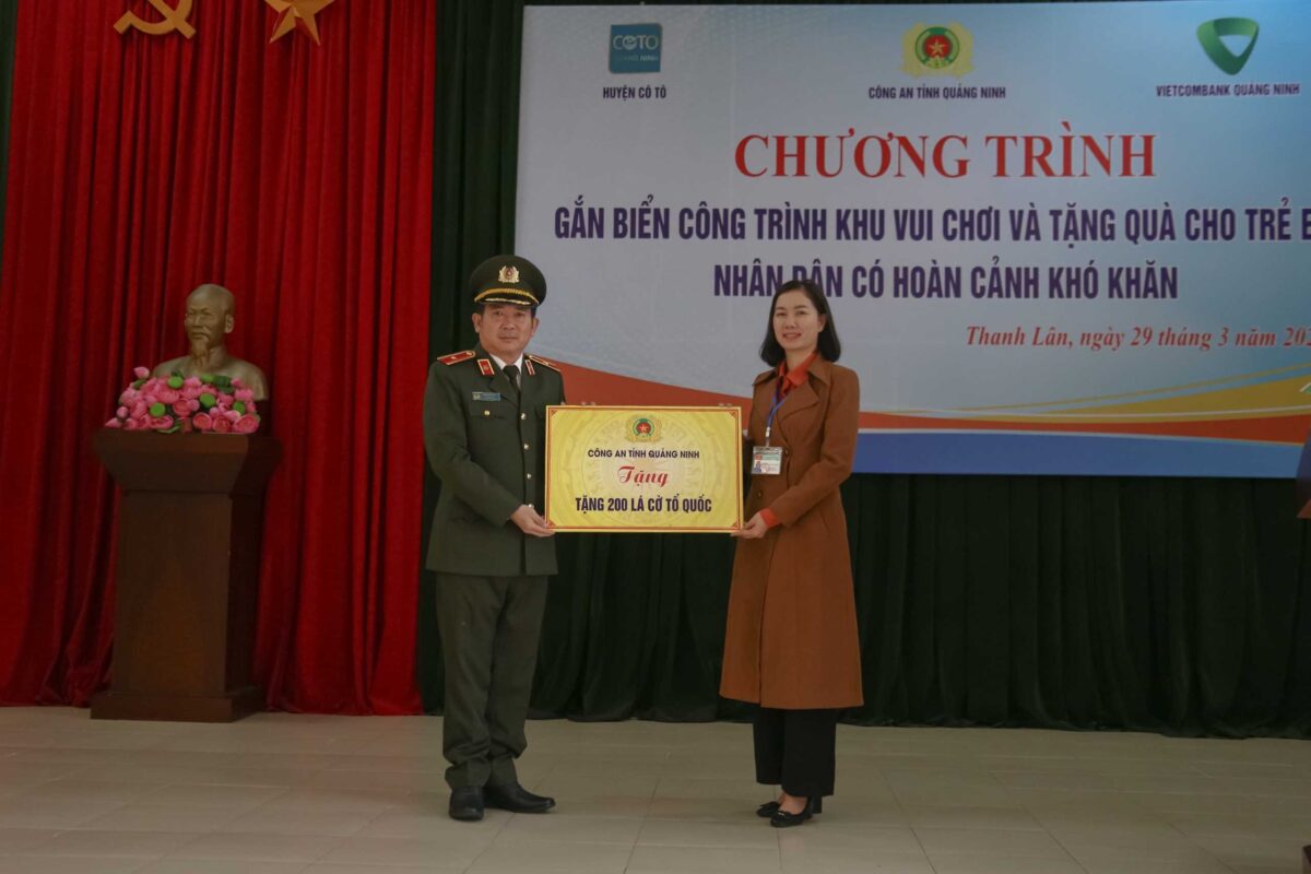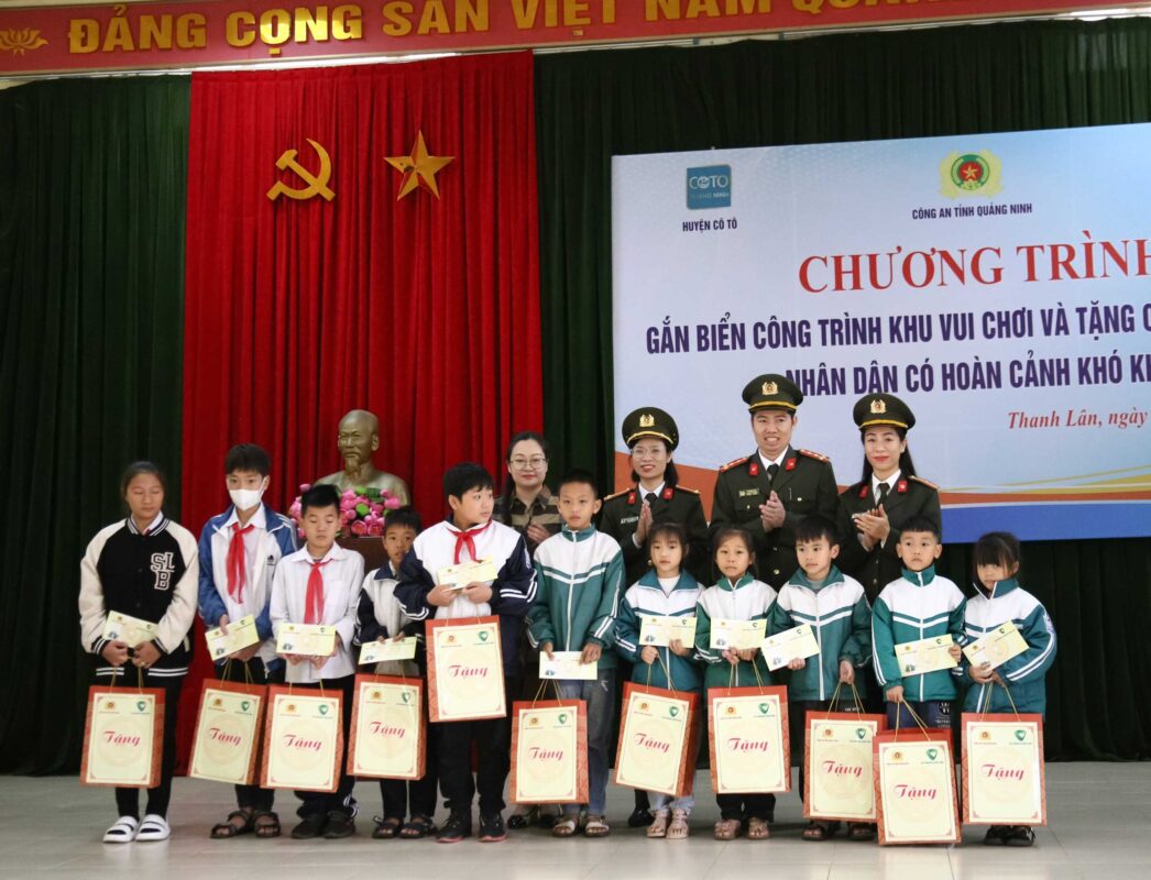 Tại chương trình, Công an tỉnh đã tổ chức khánh thành 02 công trình “Khu vui chơi trẻ em”, tặng quà cho Công xã Thanh Lân, Đồng Tiến, thị trấn Cô Tô, thăm, tặng 200 phần quà cho trẻ em và Nhân dân có hoàn cảnh khó khăn, tặng 200 cờ Tổ quốc cho ngư dân trên địa bàn huyện Cô Tô và tặng 01 bộ trống Đội cho trường Tiểu học xã Thanh Lân.