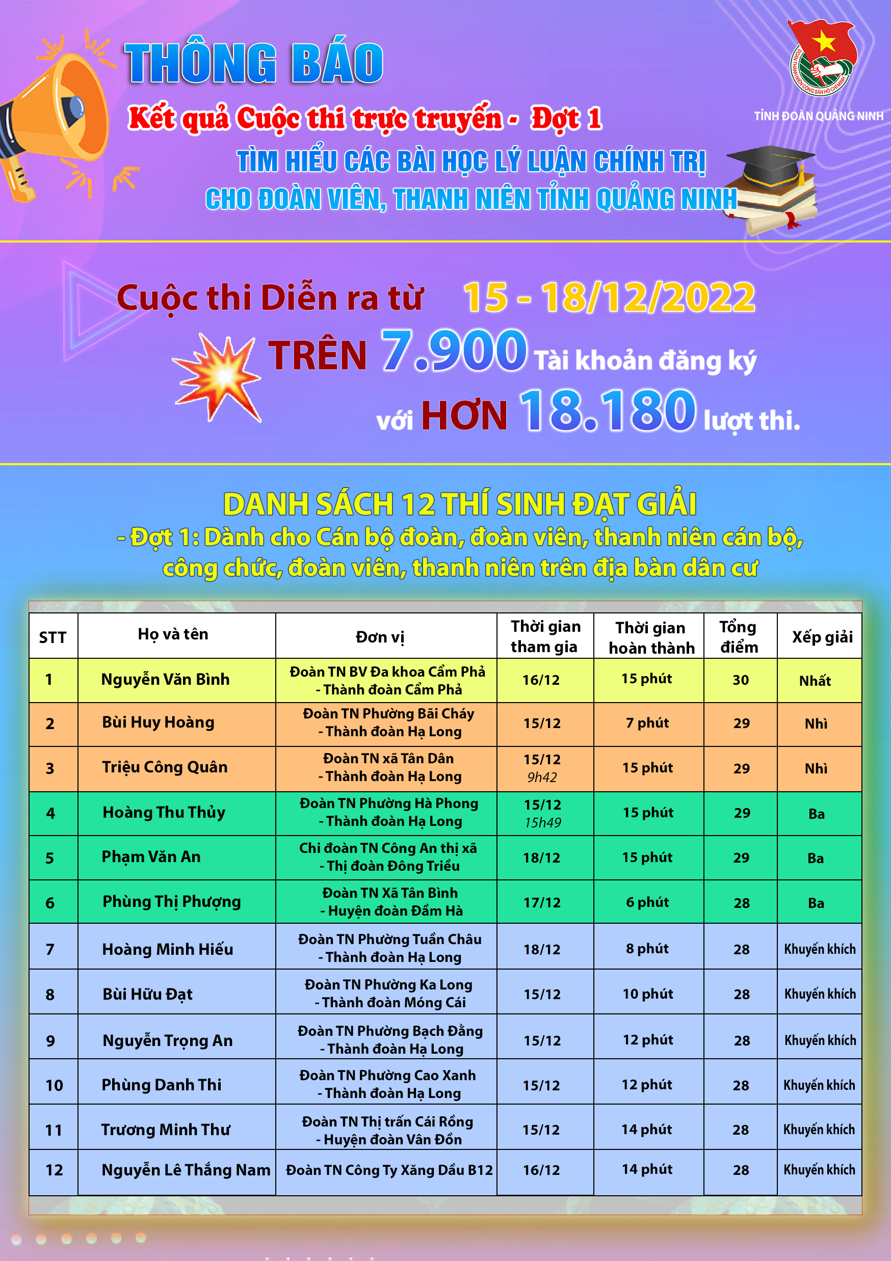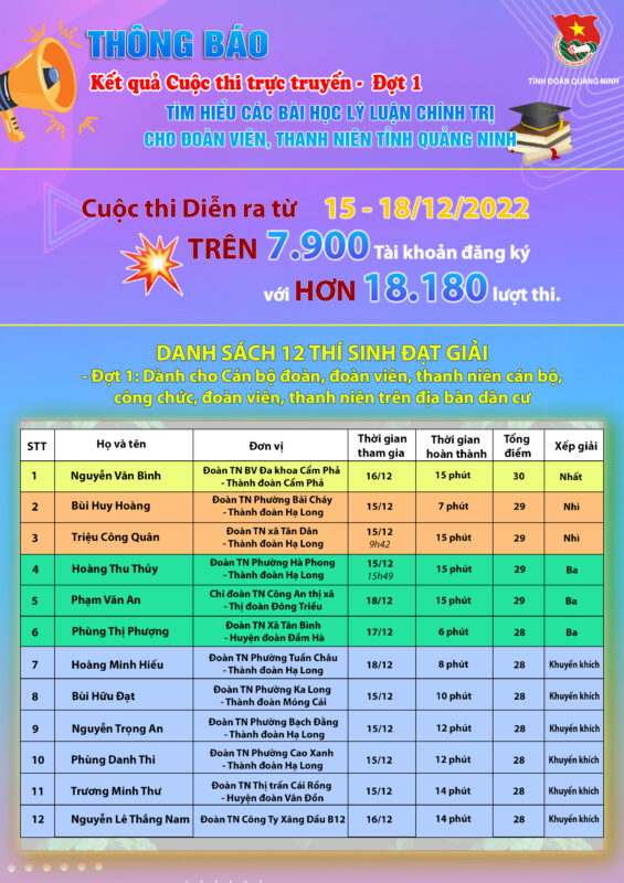 Xin chúc mừng 12 thí sinh là đoàn viên, thanh niên cán bộ công chức, thanh niên trên địa bàn dân cư trong tỉnh đã có phần thi xuất sắc đạt điểm cao trong kì thi lần này. Thông tin các thi sinh đạt giải xin mời các bạn xem chi tiết dưới đây.