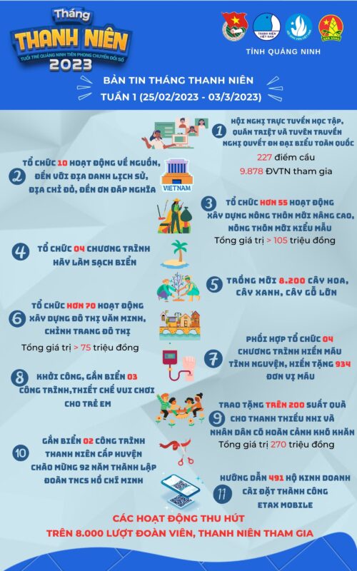 Tuần đầu ra quân Tháng Thanh niên năm 2023 đã cho thấy khí thế sôi nổi, sự ra quân đồng loạt của cấp bộ Đoàn toàn tỉnh. Tháng Thanh niên đã chính thức bước vào nhứng ngày cao điểm nhất. Cùng chờ đón sự bùng nổ của các đơn vị.