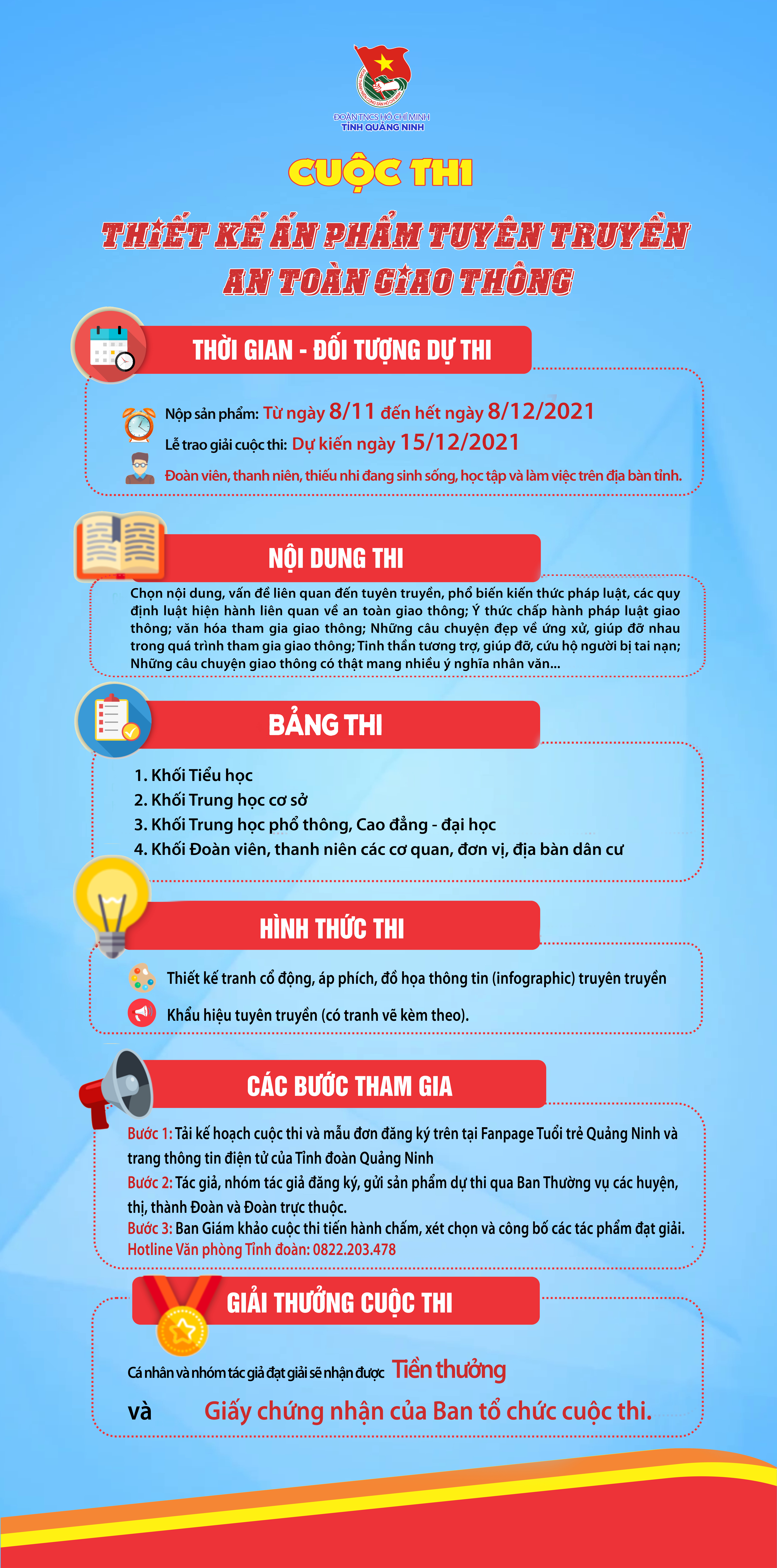 Cuộc thi do Ban Thường vụ Tỉnh đoàn phối hợp cùng Ban An toàn giao thông tỉnh và các cơ quan, đơn vị liên quan tổ chức, thời gian thi được bắt đầu từ ngày 8/11/2021 đến 8/12/2021. Thí sinh đăng ký tham gia tải đơn đăng ký dưới đây hoặc truy cập Fanpage Tuổi trẻ Quảng Ninh và gửi đơn đến Ban Thường vụ các huyện, thị, thành đoàn và Đoàn trực thuộc. Mọi thắc mắc liên hệ Hotline Văn phòng Tỉnh đoàn: 0822.203.478.