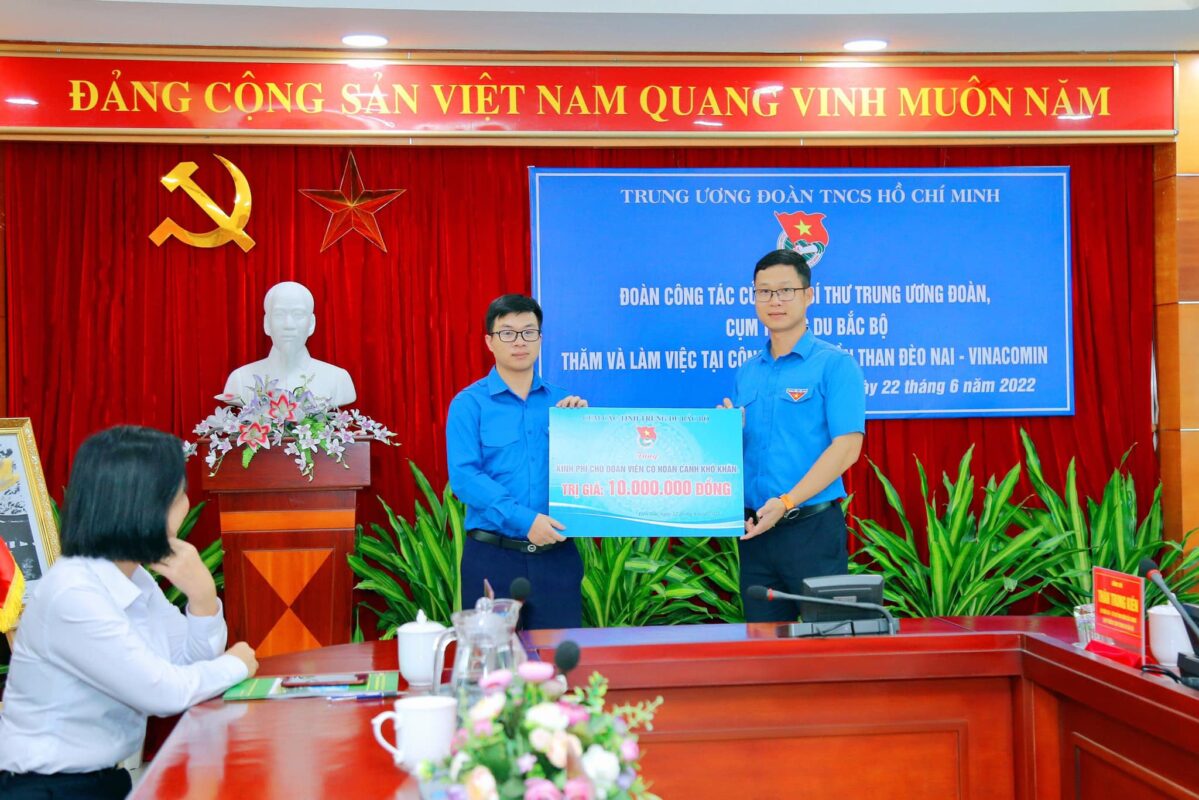 Trong khuôn khổ chương trình, Đoàn công tác đã được nghe Ban Lãnh đạo Công ty báo cáo tình hình sản xuất của đơn vị trong 6 tháng đầu năm 2022 và công tác lãnh chỉ đạo, tạo điều kiện tổ chức Đoàn Thanh niên Công ty hoạt động có hiệu quả. Cụm đoàn các tỉnh trung du bắc bộ dành tặng kinh phí 10 triệu đồng, hỗ trợ cho đồng chí Phạm Tiến Dũng – đoàn viên công ty Than Đèo Nai, có hoàn cảnh khó khăn.