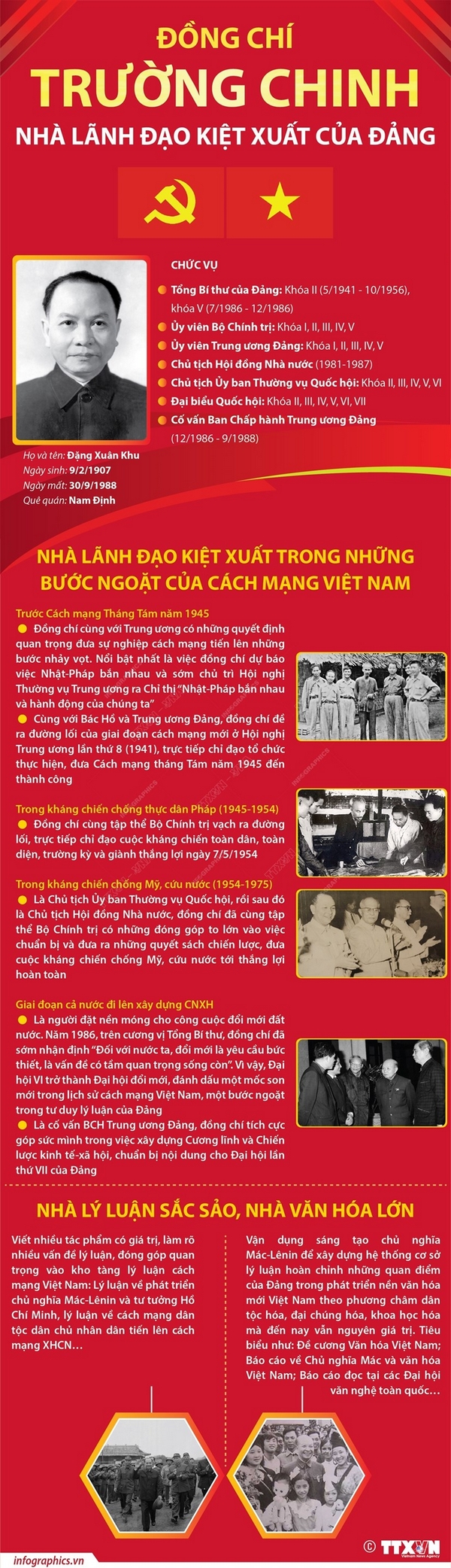 Đồng chí Trường Chinh thuộc lớp đảng viên đầu tiên của Đảng Cộng sản Việt Nam do lãnh tụ Nguyễn Ái Quốc sáng lập. Đồng chí là nhà chính trị tài ba, nhà tư tưởng-lý luận chính trị kiệt xuất, nhà văn hóa lớn. Với 81 tuổi đời, hơn 60 năm hoạt động cách mạng (1925-1988), đồng chí đã đảm nhiệm nhiều vị trí, trọng trách quan trọng của Đảng, Nhà nước.