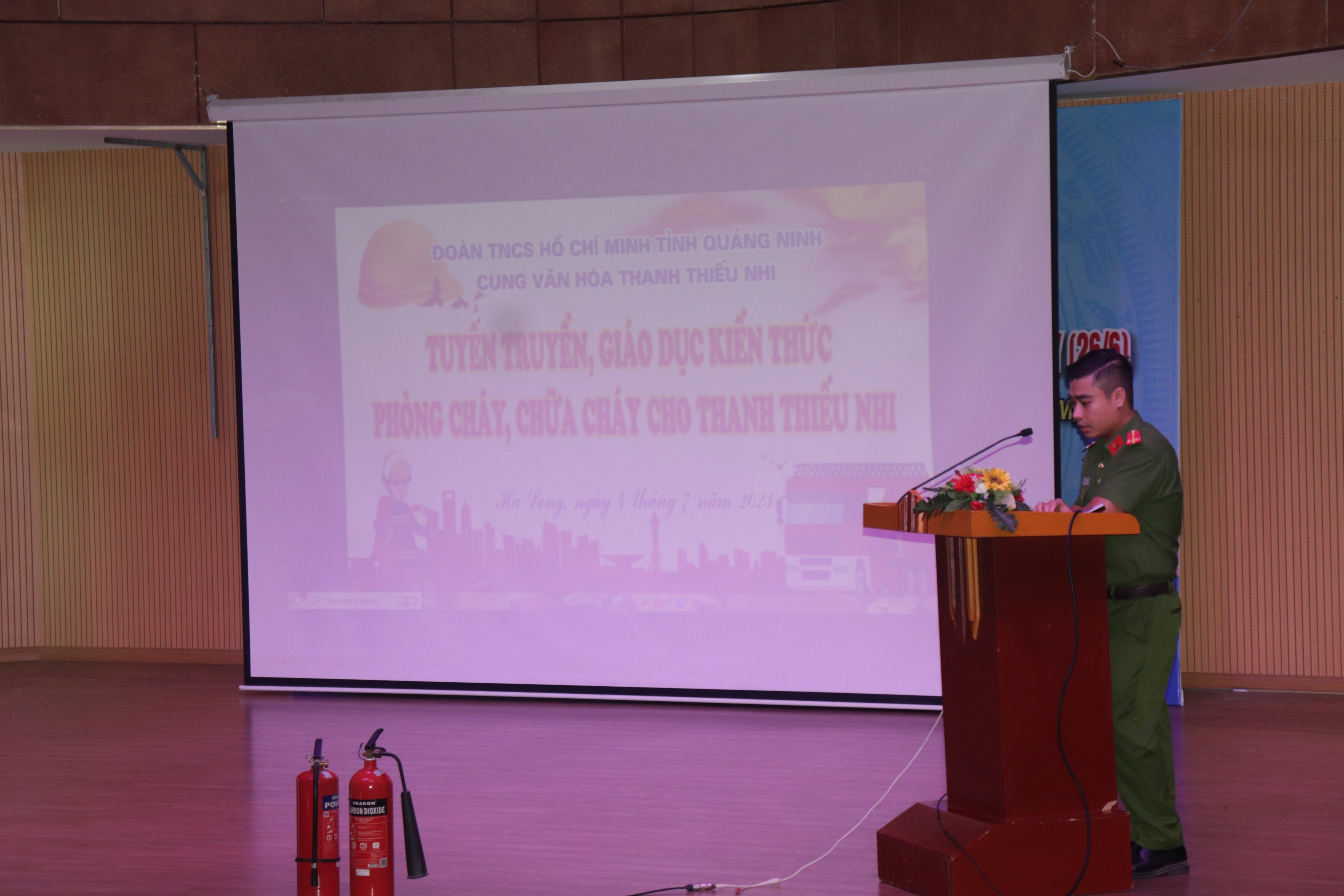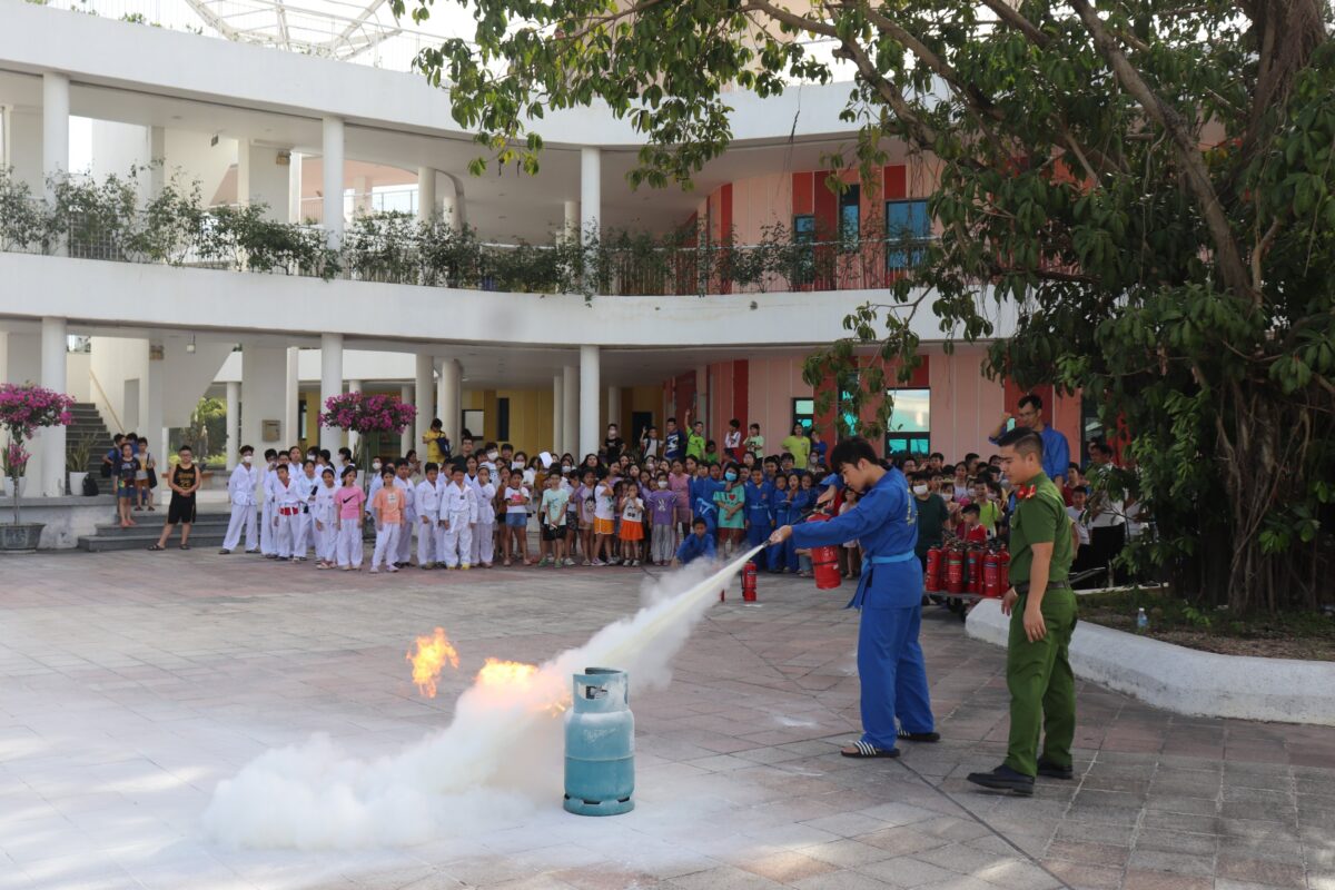 Thực hiện chỉ thị số 33 /CT ngày 29/5/2023 của BTV Tỉnh ủy về tăng cường sự lãnh đạo của Đảng đối với công tác đảm bảo trật tự, an toàn giao thông, phòng, chống tai nạn thương tích và đuối nước; quản lý và giáo dục thanh thiêu nhi, học sinh trong dịp hè trên địa bàn tỉnh Quảng Ninh; Kế hoạch số 104/KH-UBND ngày 21/4/2023 của UBND tỉnh Quảng Ninh về việc triển khai tháng hành động vì trẻ em và các hoạt động quản lý, giáo dục thanh thiếu nhi, học sinh hè năm 2023, nhằm tổ chức công tác tuyên truyền, giáo dục kiến thức phòng cháy, chữa cháy, thoát hiểm trong các tình huống có cháy cho học sinh đang sinh hoạt tại Cung, ngày 4/7/2023 Cung VHTTN đã tổ chức buổi tuyên truyền kỹ năng, kiến thức phòng cháy, chữa cháy cho học sinh.