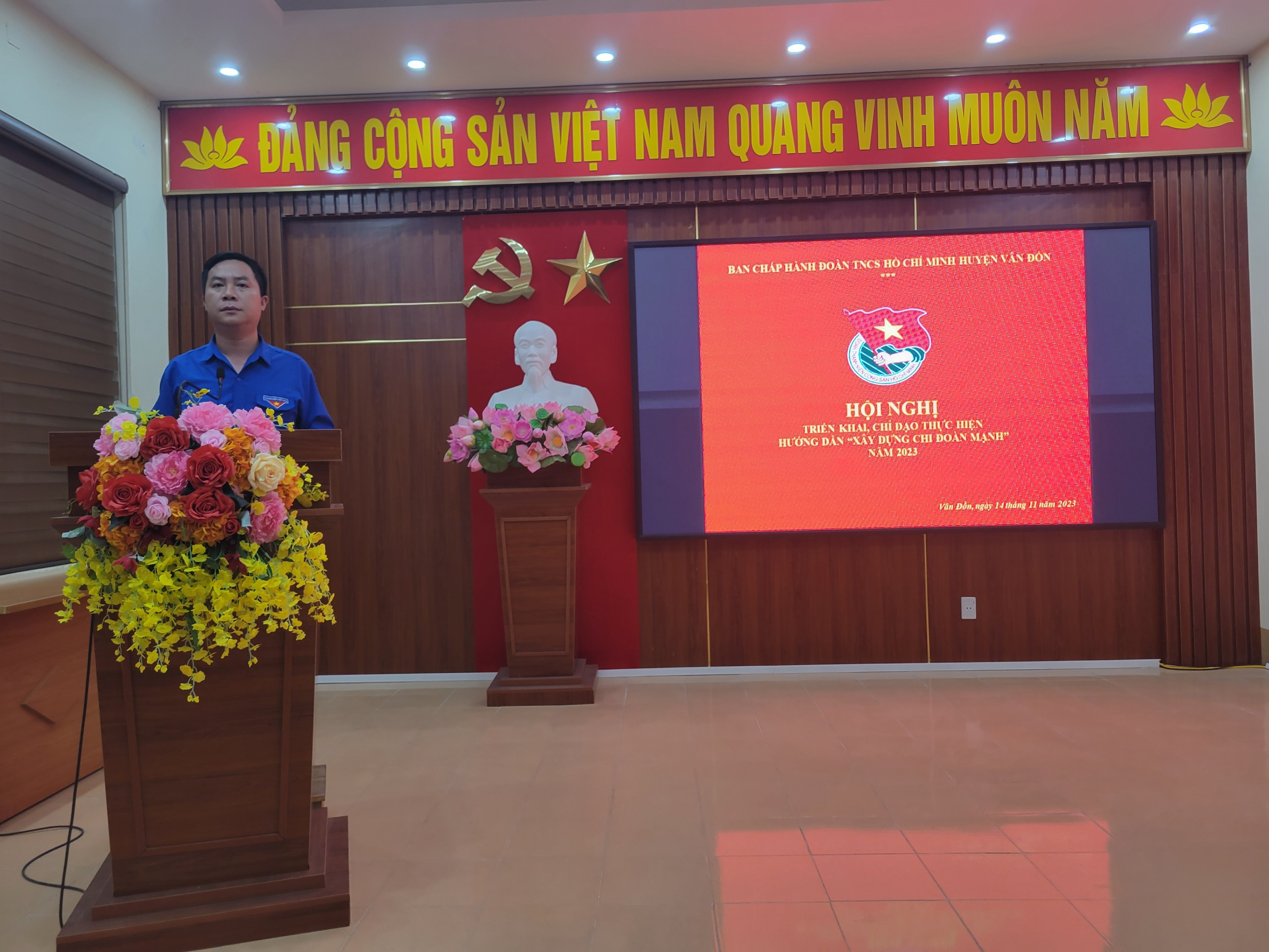 Ngày 14/11/2023, Ban Thường vụ Huyện đoàn Vân Đồn tổ chức hội nghị triển khai hướng dẫn xây dựng “Chi đoàn mạnh” với các nội dung về việc xây dựng “Chi đoàn mạnh” trên cả 3 mặt: Tư tưởng chính trị, tổ chức hoạt động và xây dựng tổ chức với những nội dung cụ thể như sau: chi đoàn mạnh về tư tưởng chính trị; chi đoàn mạnh về tổ chức hoạt động; chi đoàn mạnh về xây dựng tổ chức.