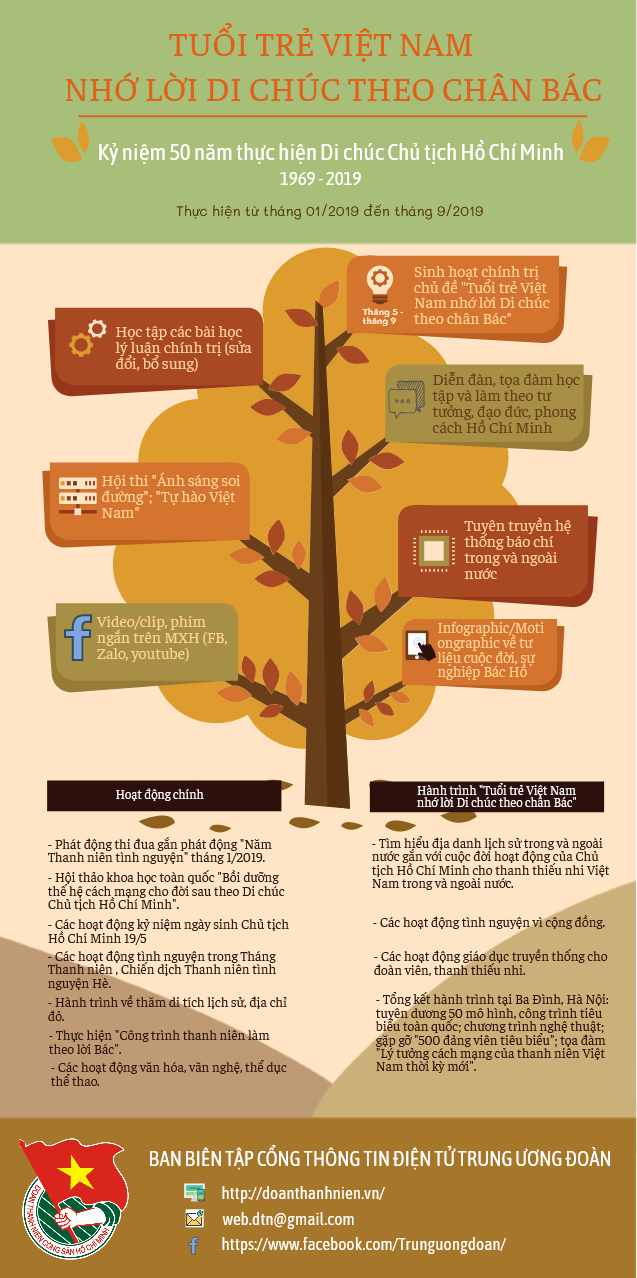 INFOGRAPHIC Nhiều hoạt động kỷ niệm 50 năm Di chúc Bác Hồ Posted on 4 Tháng Chín, 201911 Tháng Chín, 2019 by admin 04 Th9 Lượt xem: 231 Nhiều hình thức tuyên truyền và hoạt động sẽ được các cấp bộ Đoàn tổ chức kỷ niệm 50 năm thực hiện Di chúc Bác Hồ từ tháng 01 đến tháng 9/2019. Bài viết liên quan:Nhiều hoạt động đạt hiệu quả tích cực của Câu lạc bộ…An Giang: 157 thí sinh tham dự Hội thi Tin học khối…Nhiều việc làm thiết thực của tuổi trẻ Cẩm PhảKỹ sư trẻ nhiều sáng kiến100% đoàn cấp huyện tổ chức tọa đàm hoặc diễn đàn…Bắc Ninh tổ chức Diễn đàn “Góp ý, sửa đổi luật thanh niên”Diễn đàn “Tuổi trẻ Quảng Ninh nhớ lời di chúc theo chân Bác”Tuổi trẻ Quảng Ninh nhớ lời Di chúc theo chân BácNghệ An: hoạt động tình nguyện “Hành quân xanh”.Nghệ An: Khen thưởng hoạt động tình nguyện và Tháng…