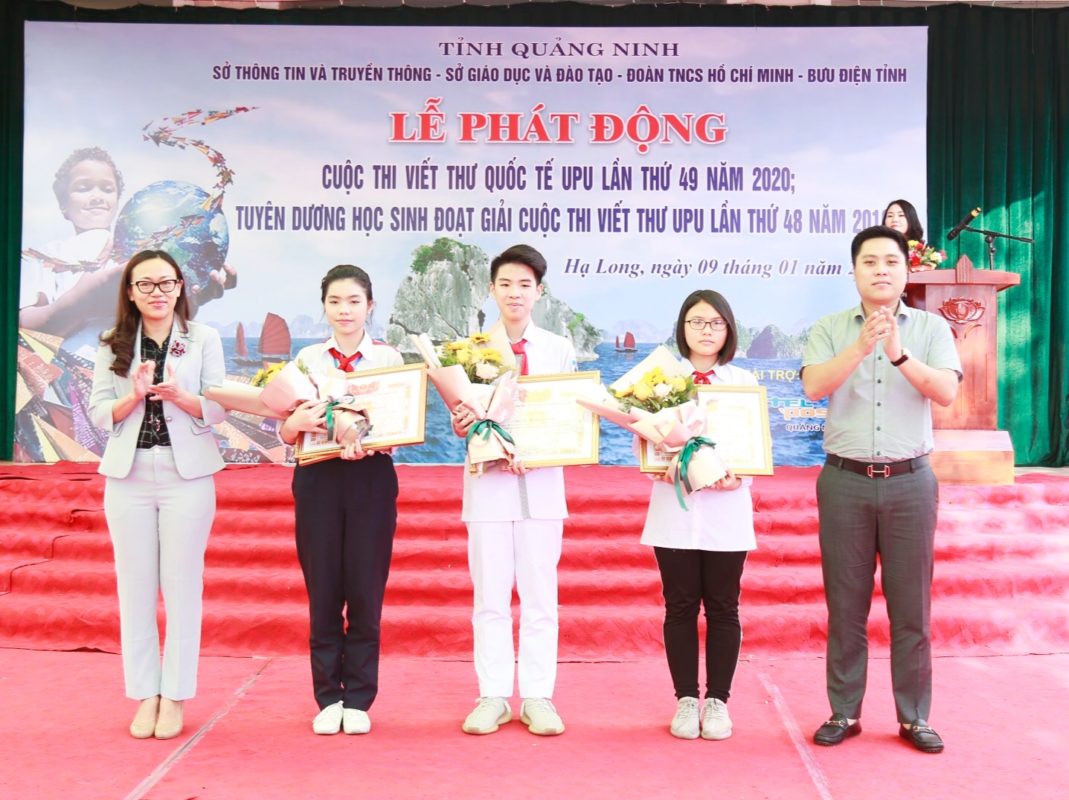 Kết thúc cuộc thi viết thư quốc tế UPU lần thứ 48 – 2019, với chủ đề “Hãy viết một bức thư về người hùng của em”, vượt qua hơn 1 triệu bài tham dự, tỉnh Quảng Ninh đã có 3 giải “Cây bút triển vọng” là em Lê Quang Minh – lớp 7A10, Trường THCS Trần Quốc Toản (TP Hạ Long), em Đào Khánh Huyền – lớp 8E, Trường THCS Cửa Ông (TP Cẩm Phả), em Nguyễn Thủy Chi – lớp 7B7, Trường THCS Mạo Khê 2 (TX Đông Triều).