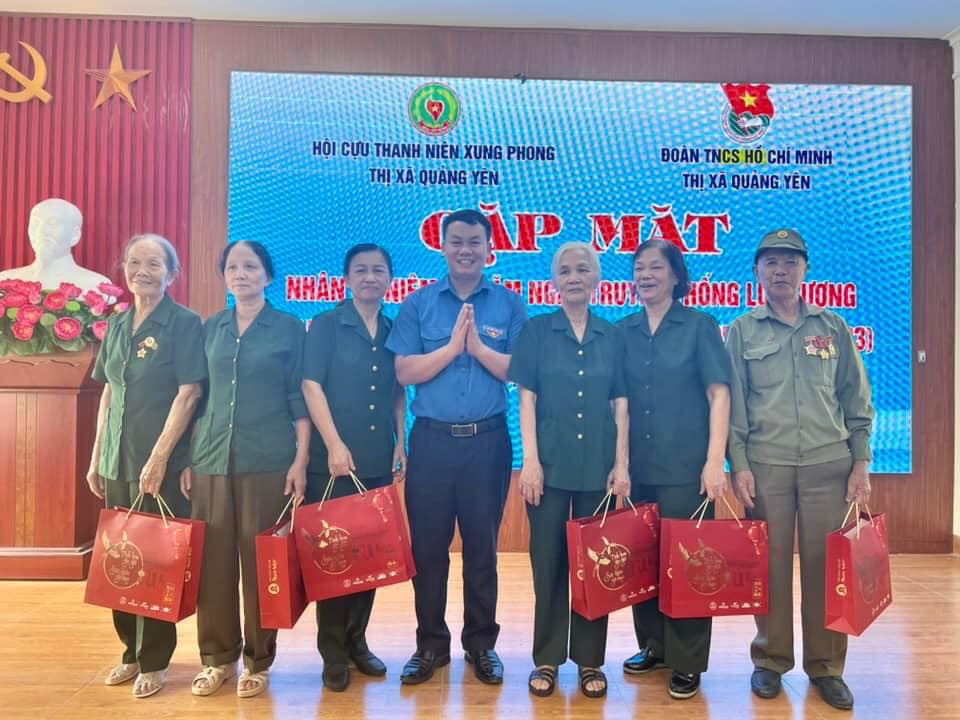 | Đồng chí Đoàn Phúc Trường – Phó Bí thư Thị đoàn Quảng Yên (đứng đầu tiên bên trái) tặng quà một số hội viên Hội Cựu TNXP có hoàn cảnh khó khăn trên đia bàn thị xã |