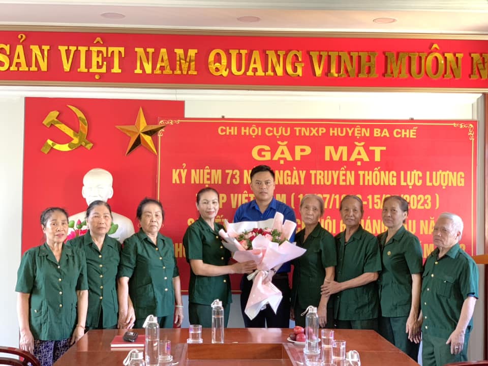 | Đồng chí Lê Minh Đạt – Bí thư Huyện đoàn Ba Chẽ tặng hoa các Cựu thanh niên xung phong có hoàn cảnh khó khăn |