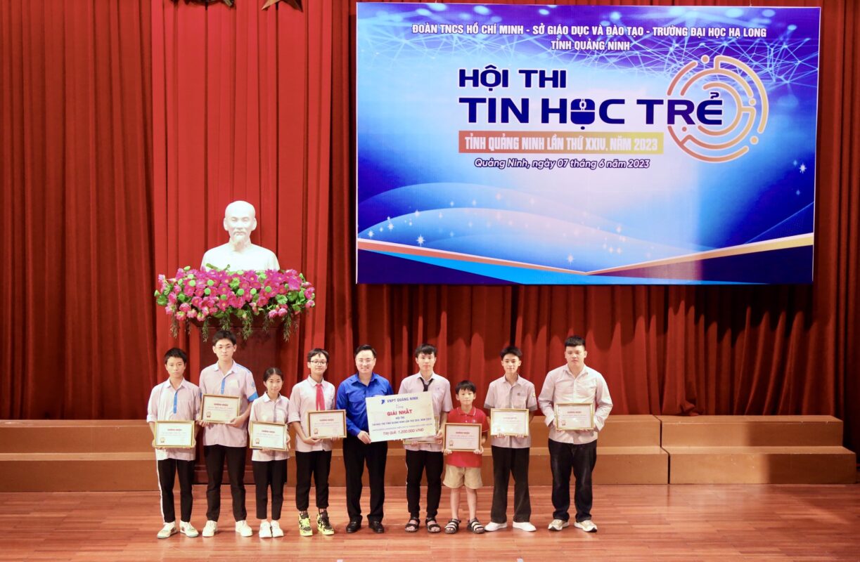 Bí thư Tỉnh Đoàn Hoàng Văn Hải trao giải nhất Hội thi Tin học trẻ năm 2023 cho các thí sinh.