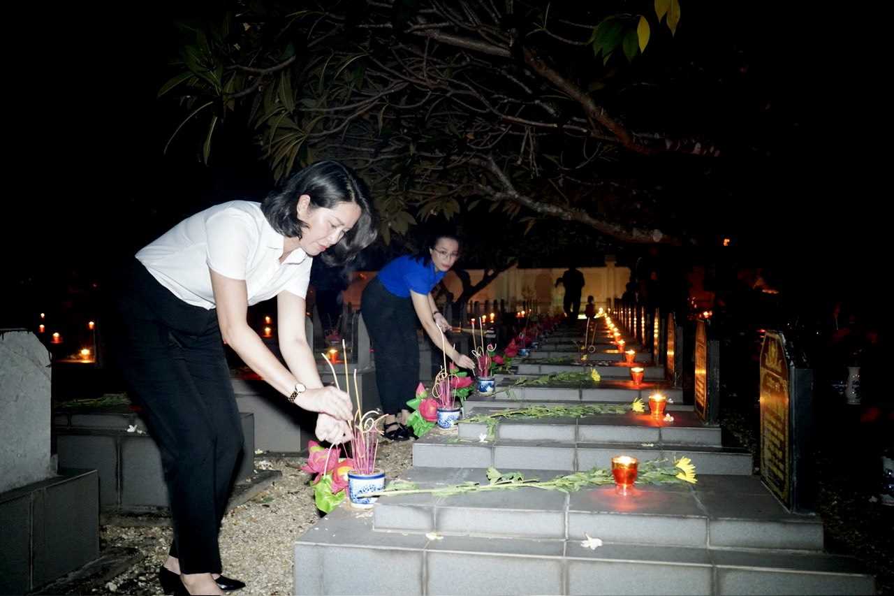 Trong không khí trang nghiêm tại Nghĩa trang liệt sĩ thành phố, sau phút mặc niệm, đoàn đại biểu, đoàn viên thanh niên các đơn vị đã thắp nến, dâng hoa, dâng hương thành kính tưởng nhớ công ơn của các anh hùng liệt sĩ đã hy sinh anh dũng vì sự nghiệp giải phóng đất nước, xây dựng và bảo vệ Tổ quốc.