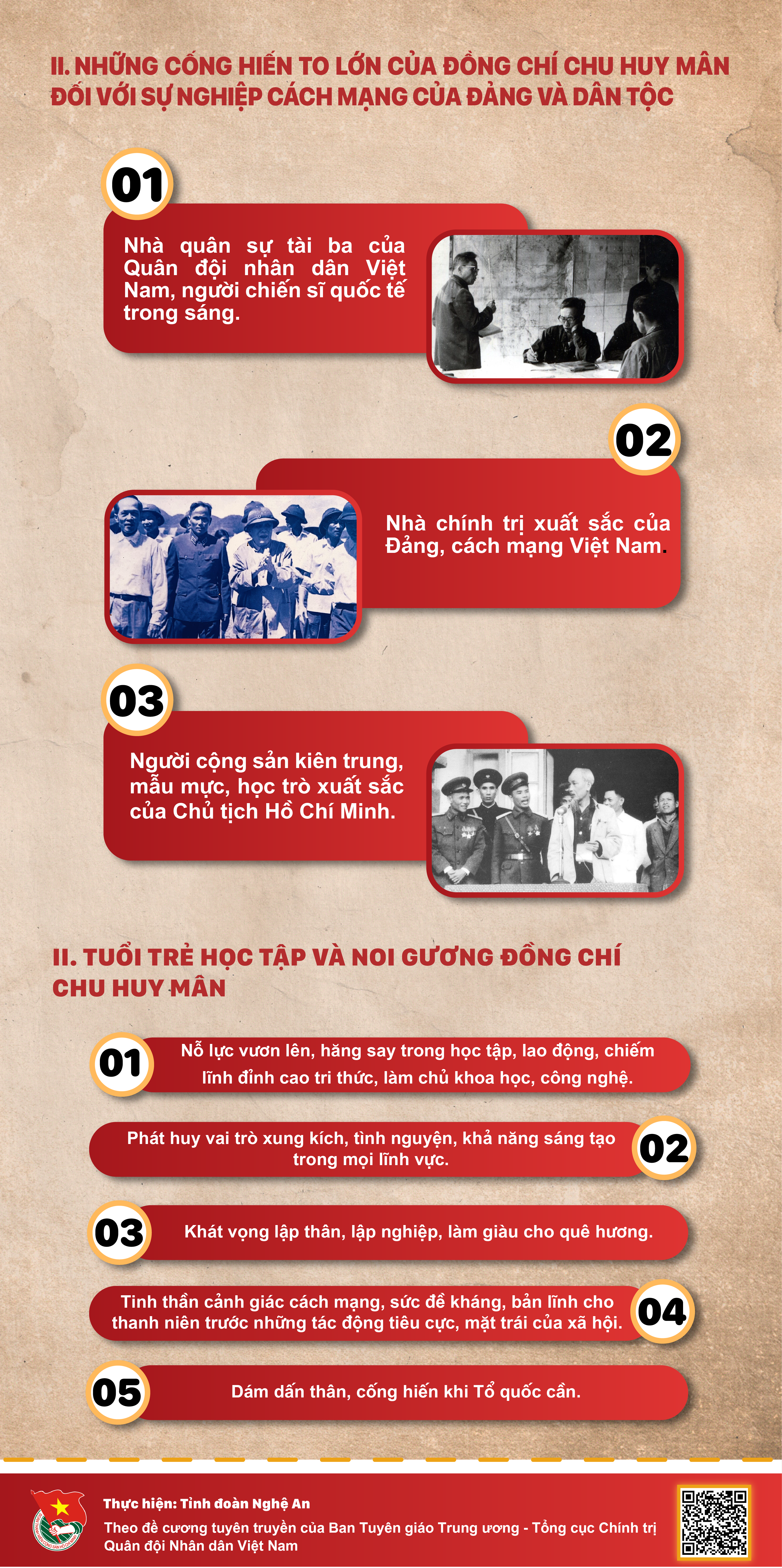 Cuộc đời và sự nghiệp cách mạng của đồng chí Chu Huy Mân đã để lại cho lớp lớp các thế hệ thanh niên Nghệ An nhiều bài học quý giá. Học tập và noi theo tấm gương đồng chí Chu Huy Mân, thế hệ trẻ hôm nay quyết tâm học tập, lao động, sản xuất góp sức phát triển quê hương, đất nước.